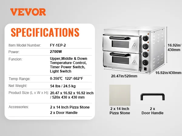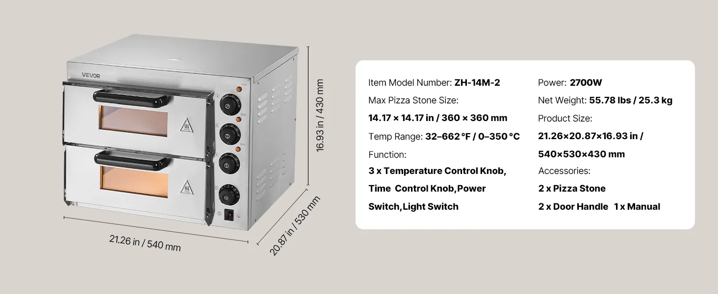 Enjoy Crispy Pizzas Every Time: The 2700W powerful commercial pizza oven empowers you to bake crispy and yummy pizza just in few minutes. Coupled with top and bottom dual heating tubes, it unleashes 360° uniform baking and sufficient heat to swiftly cook your food to deliciousness every time