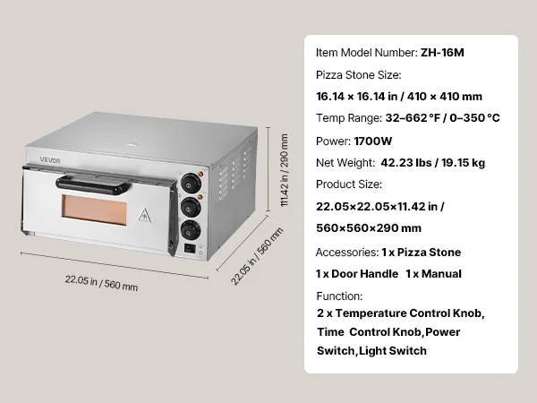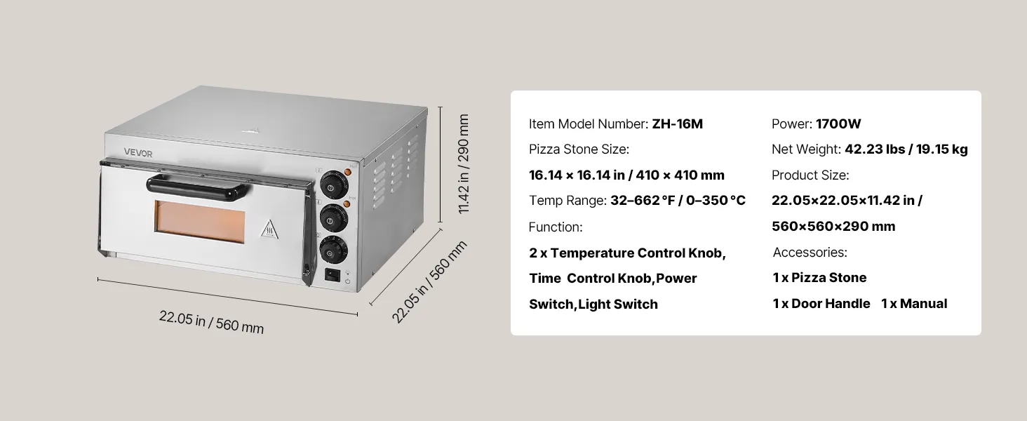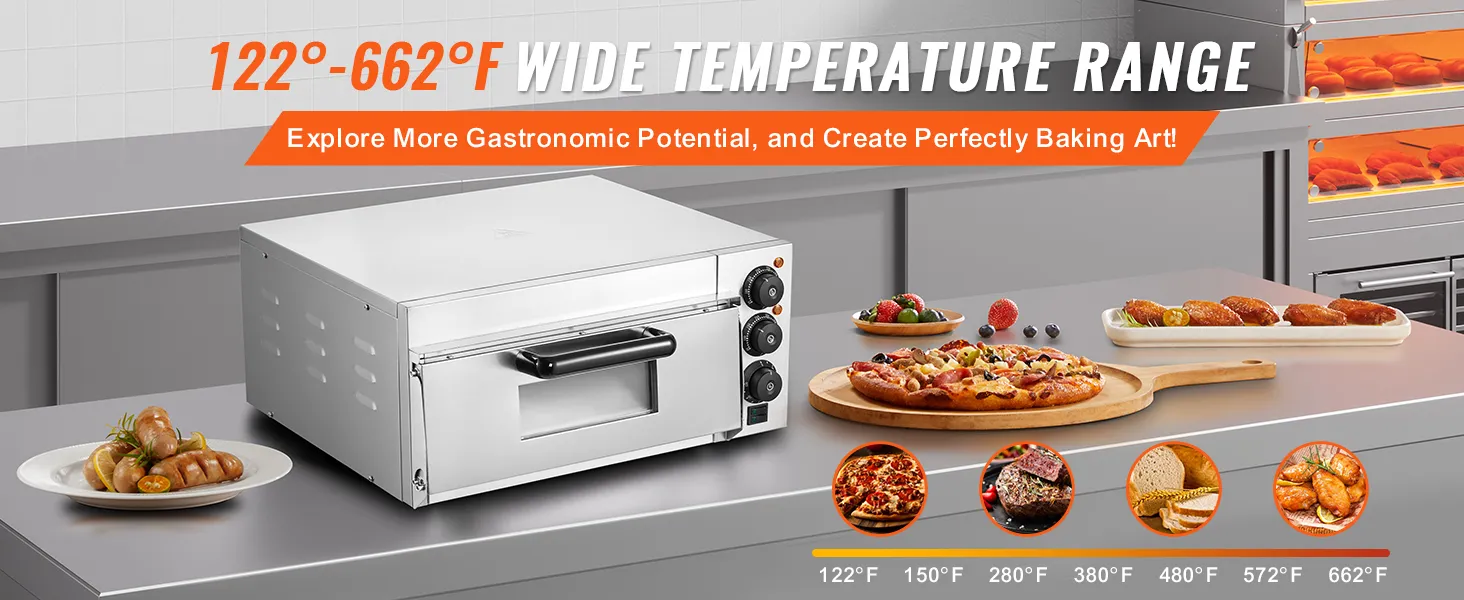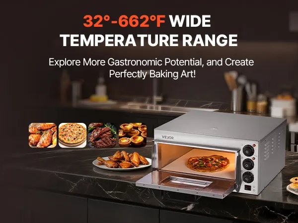 Enjoy Crispy Pizzas Every Time: The 1700W powerful commercial pizza oven empowers you to bake crispy and yummy pizza just in few minutes. Coupled with top and bottom dual heating tubes, it unleashes 360° uniform baking and sufficient heat to swiftly cook your food to deliciousness every time