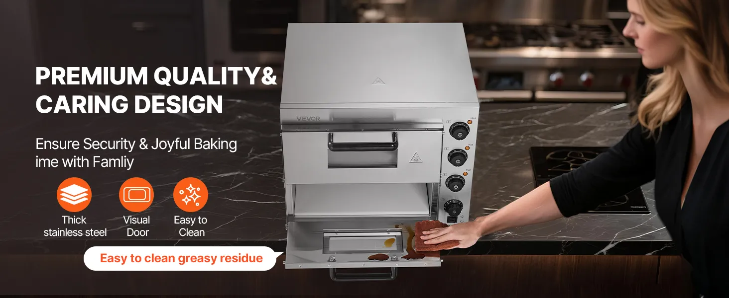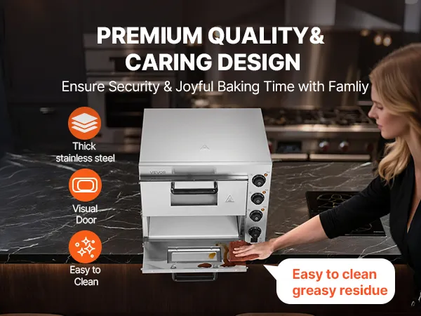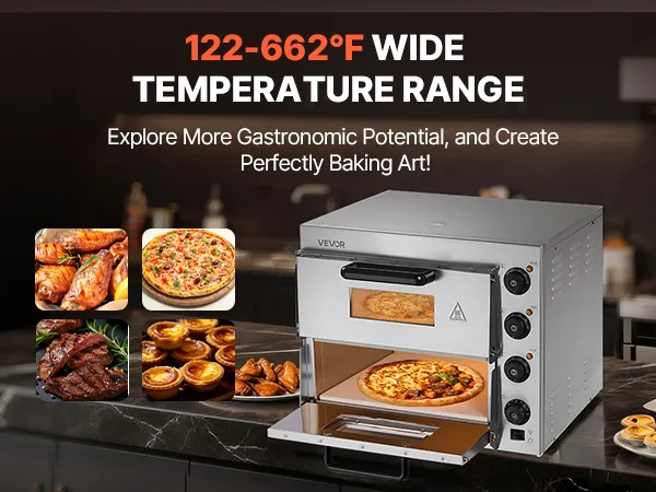 Hoogwaardige elektrische pizzaoven: de VEVOR elektrische pizzaoven is gemaakt van roestvrij staal van voedingskwaliteit en garandeert een veilige en probleemloze bakervaring. Gecombineerd met de meegeleverde pizzasteen en deurgreep kunt u met deze pizzaoven voor op het aanrecht knapperige pizza's tot 406 mm groot bakken - perfect voor uw keuken, thuis, op de camping en op feestjes.
