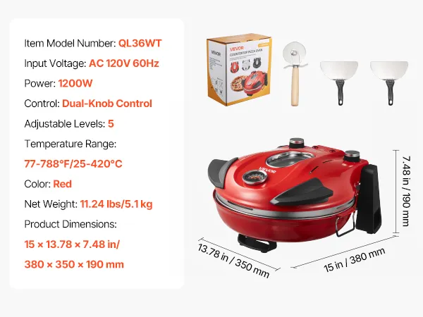 VEVOR Pizza Oven, 12 in Electric Pizza Maker, 1200W Electric Pizzas Cooker with Cordierite Stone, 5-Mode Temperature Control, Viewing Window for Precise Cooking, Heats up to 788 ˚F, for Home (Red)