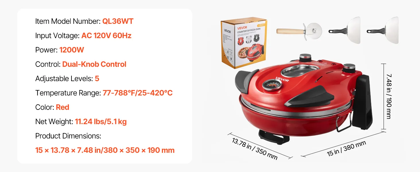Versatile Cooking: Featuring a deep design, the countertop pizza maker provides ample space. It is a versatile helper, ideal for baking thick homemade pizza, wings, sausages, steaks, and other dishes