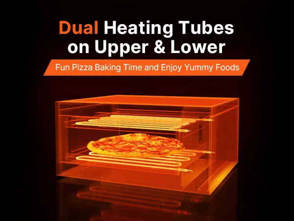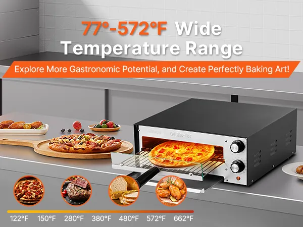 Geniet elke keer van knapperige pizza: met de krachtige 1450W professionele pizzaoven bak je in een mum van tijd knapperige en heerlijke pizza's. Dankzij de dubbele verwarmingsbuizen boven en onder zorgt de oven voor een gelijkmatige baktemperatuur van 360° en voldoende warmte om je eten elke keer snel en perfect te bereiden.