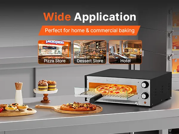 Veelzijdig: Onze elektrische pizzaoven is ideaal voor thuis- en professioneel gebruik en een uitstekende keuze voor restaurants, keukens, snackbars, bakkerijen, familiebijeenkomsten en feesten. Deze veelzijdige pizzaoven is niet alleen geschikt voor het bakken van heerlijke pizza's en pretzels, maar kan ook worden gebruikt voor aardappelen, brood, gebak, taarten en gebak, kippenvleugels en meer.