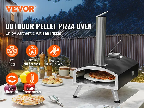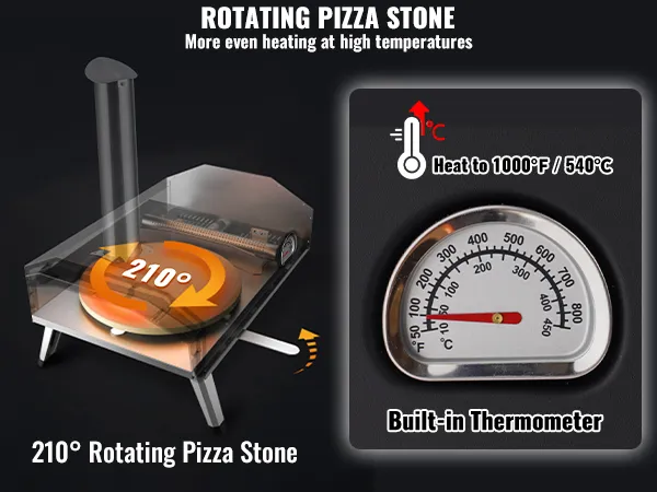 Efficient and Even Baking: Preheat in 15 minutes, bake in 90 seconds, with temperatures reaching up to 1000°F / 540℃. The 210° rotating pizza stone ensures uniform baking without the need to frequently remove the pizza to rotate, making the baking process more even. Ideal for baking 12-inch pizzas and cooking various meats, fish, and vegetables.