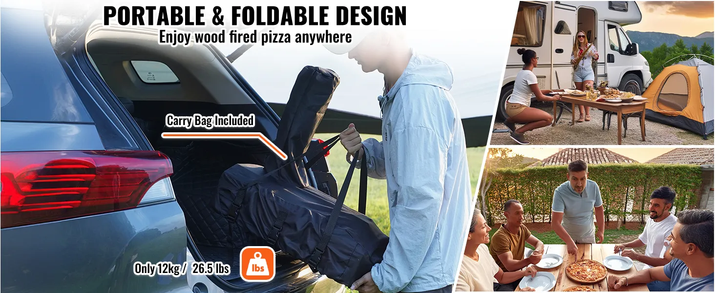 Bake a 12-inch pizza in just 90 seconds with temperatures reaching up to 1000℉ / 540℃. Use wood pellets, wood chips, or charcoal as fuel. The foldable legs make it lightweight at 26.5 lbs / 12 kg, perfect for carrying to any outdoor location, ideal for family and friends gatherings.