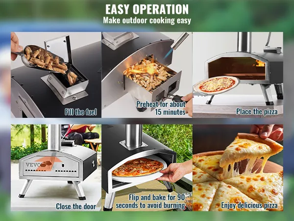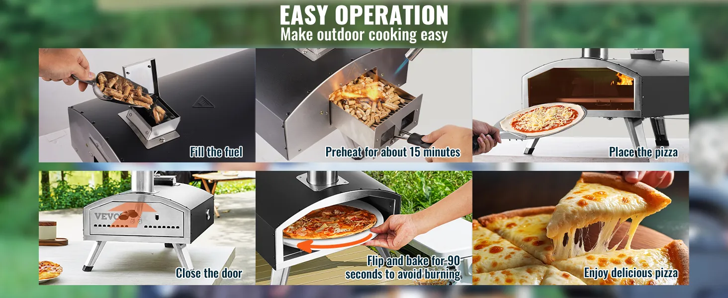 Simple Operation: Load fuel, ignite, preheat the pizza oven, place the pizza inside, occasionally rotate by hand to prevent scorching, and enjoy your meal.