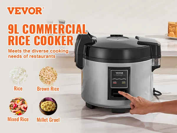 This commercial rice cooker has a total capacity of 9 liters, cooking 3.6 liters of rice at once, equivalent to 45 cups of rice, making it perfect for serving 30-40 people. Additionally, it can prepare delicious brown rice, mixed rice, millet gruel, and more, allowing you to enjoy cooked grains.