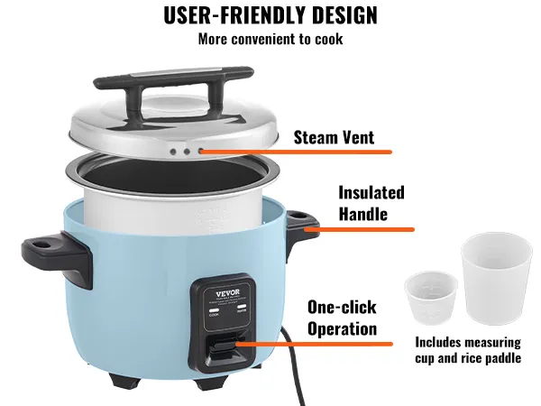 Features include a steam valve to prevent steam or water vapor loss during cooking, insulated handles to prevent burns, one-touch operation with automatic keep-warm function, and comes with a measuring cup and rice paddle for convenience in measurement and use.