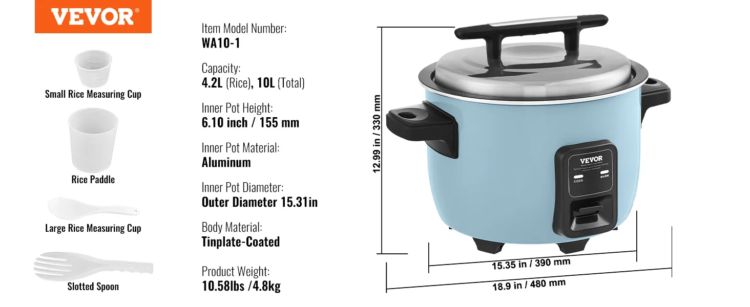 Super Large Capacity: With a total capacity of 10 liters and the ability to cook 4.2 liters of rice at once (equivalent to 50 cups of rice), it's ideal for meeting the needs of 40-50 people. Whether for large family gatherings, parties, or commercial settings, this rice cooker can serve you well.