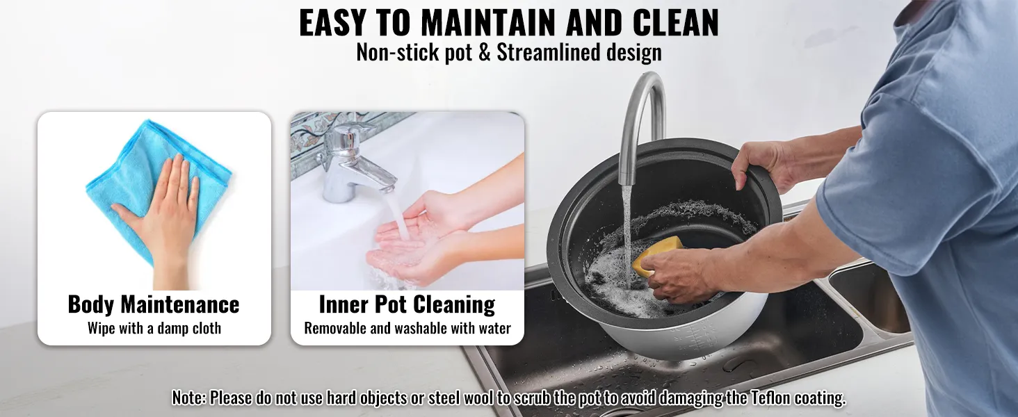 High-Quality Non-Stick Inner Pot: The non-stick inner pot and streamlined design make cleaning effortless. The non-stick surface prevents rice from sticking together, ensuring delicious and fluffy grains every time.