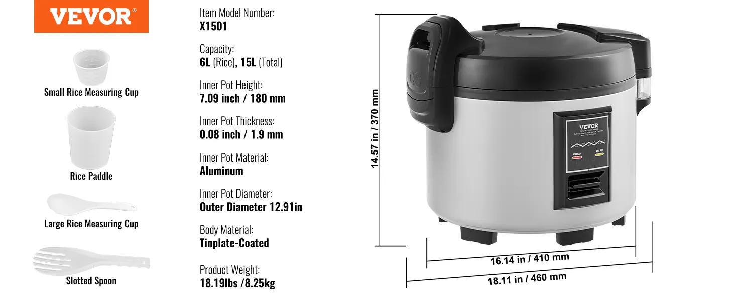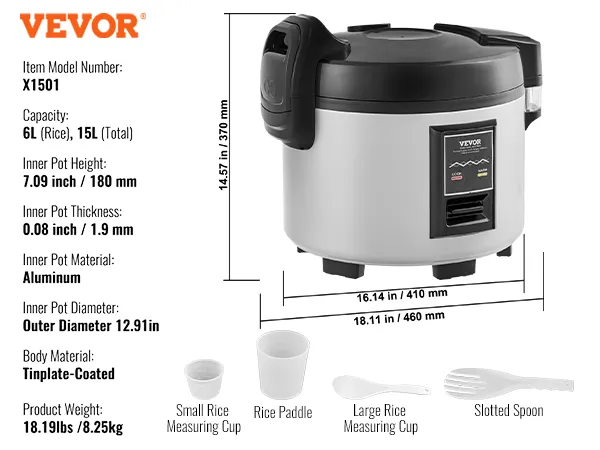 Deze commerciële rijstkoker heeft een totale inhoud van 15 liter en kan 6 liter rijst per keer koken, wat overeenkomt met 70 kopjes rijst. Dit maakt hem ideaal voor 60 tot 70 personen. Je kunt er ook heerlijke zilvervliesrijst, gemengde rijst, gierstpap en nog veel meer mee bereiden.