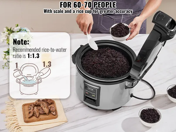 Supergrote capaciteit: met een totale capaciteit van 15 liter en de mogelijkheid om 6 liter rijst in één keer te koken (gelijk aan 70 kopjes rijst), is hij ideaal om aan de behoeften van 60 tot 70 personen te voldoen. Of het nu gaat om grote familiebijeenkomsten, feesten of zakelijke evenementen, deze rijstkoker kan u goed van dienst zijn.