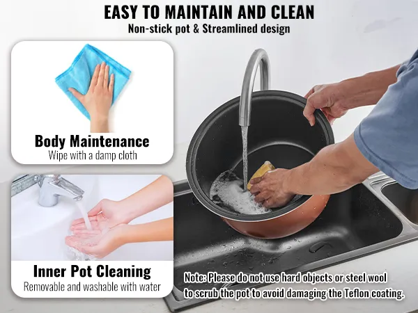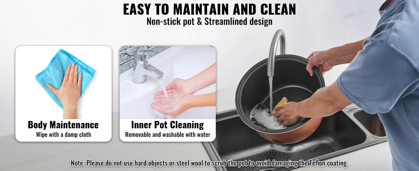 De rijstkoker maakt gebruik van een aluminium pan met een roest- en corrosiebestendige Teflon-antiaanbaklaag. Hij is gemakkelijk schoon te maken omdat de pot kan worden verwijderd en met water kan worden gewassen, waardoor het onderhoud eenvoudiger wordt en de levensduur wordt verlengd.
