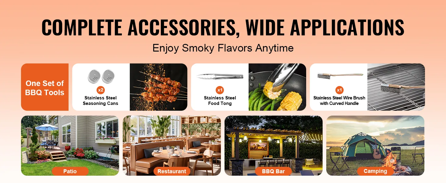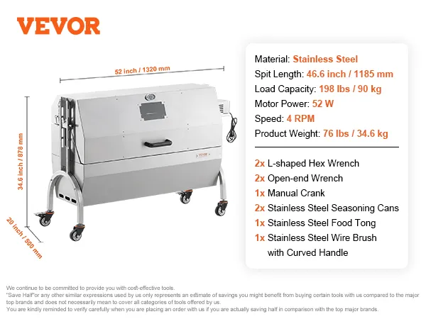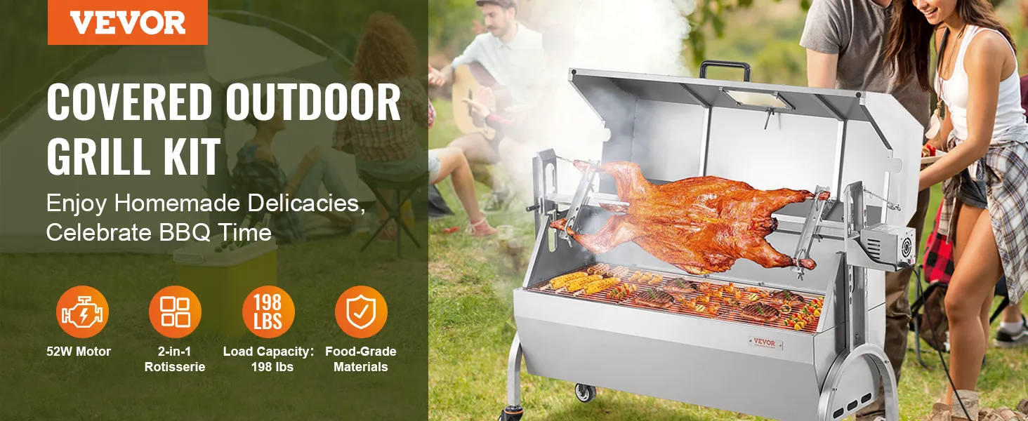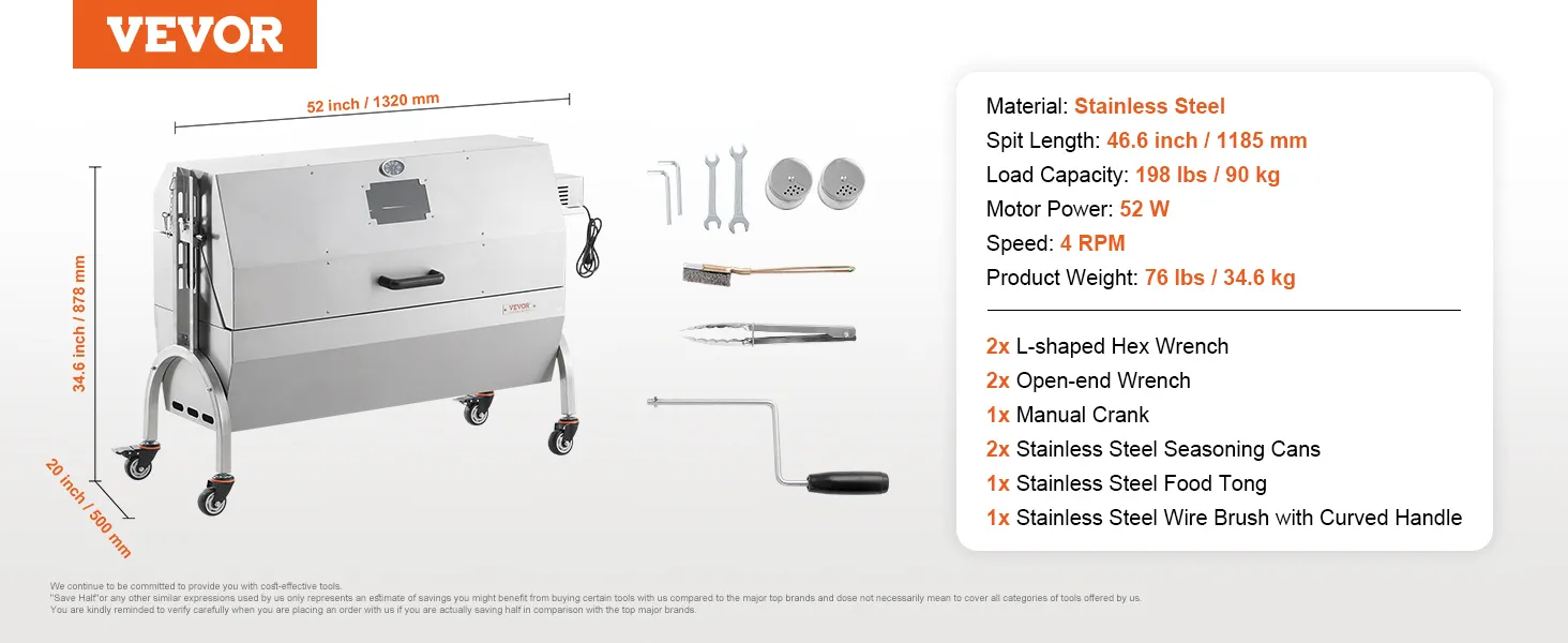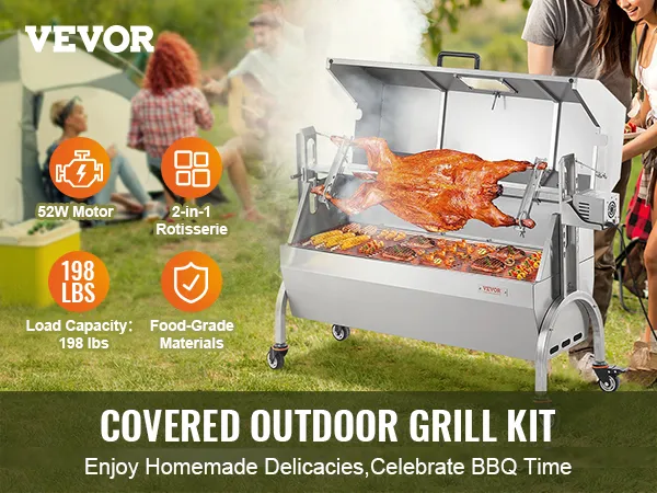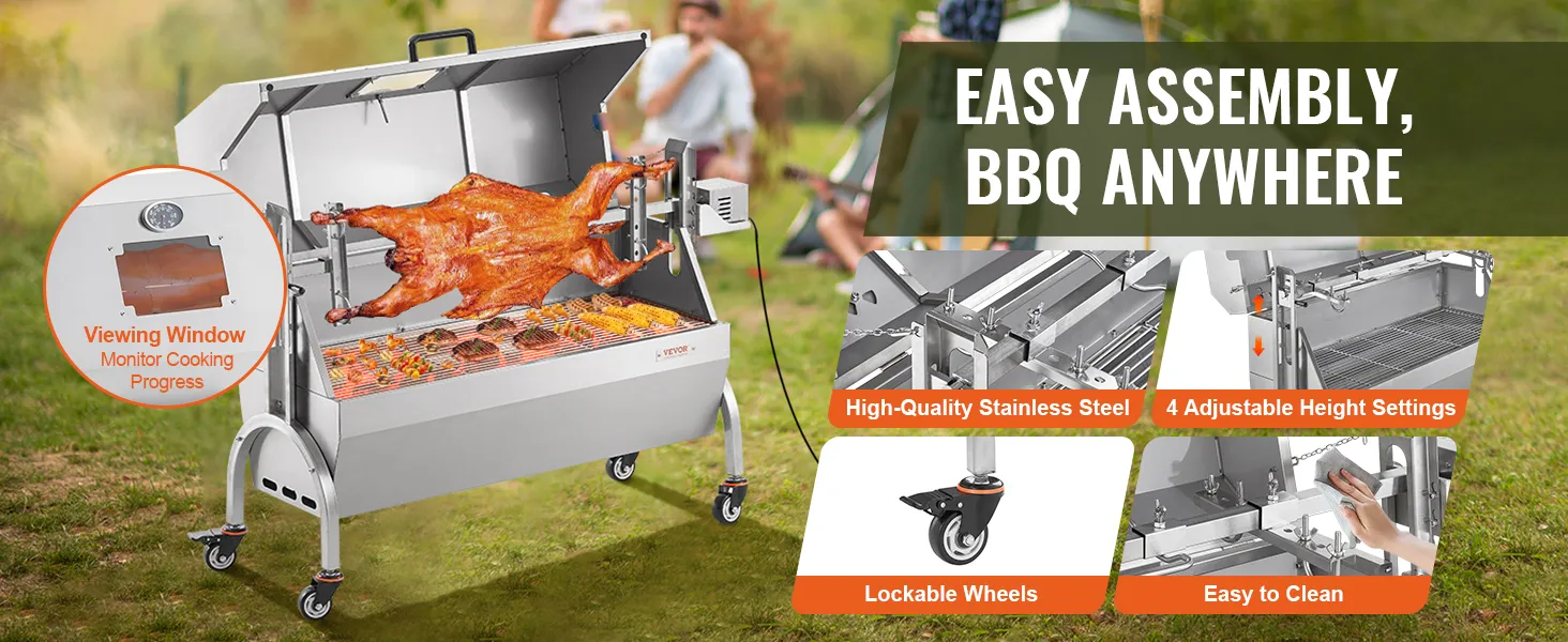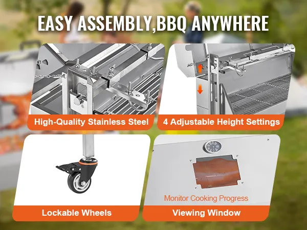 Gebruiksvriendelijk ontwerp: de roestvrijstalen draaispitgrill heeft 4 afneembare en vergrendelbare wielen die het verplaatsen vergemakkelijken en voor meer stabiliteit zorgen tijdens het grillen. Hij wordt ook geleverd met 2 kruidenflessen, een tang en een borstel, waardoor het de perfecte grill is voor open vuur en grillen aan het draaispit. Het gesloten ontwerp heeft een kijkvenster, zodat u op elk moment de gaarstatus van uw gegrilde gerechten kunt volgen.