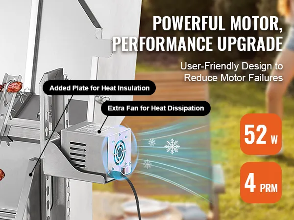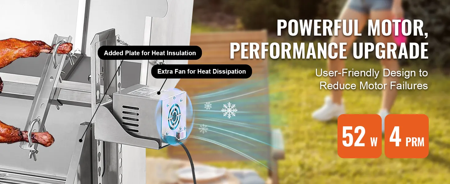Verbeterd hitteschild: de grillrotisserieset is uitgerust met een nieuwe, verbeterde motor die het grillen nog eenvoudiger maakt! Er zit een krachtige motor van 52 watt in, die het draaispit moeiteloos met 4 toeren per minuut laat draaien. De vergrote verwarmingsplaat en het hogere vermogen van de motorventilator voorkomen effectief dat warmtebronnen de motor aantasten.