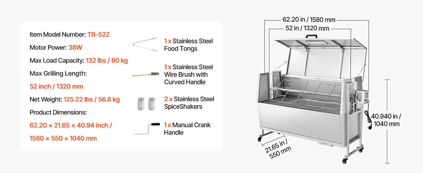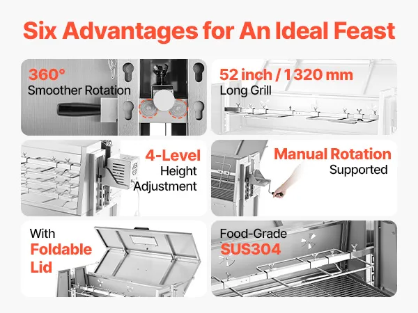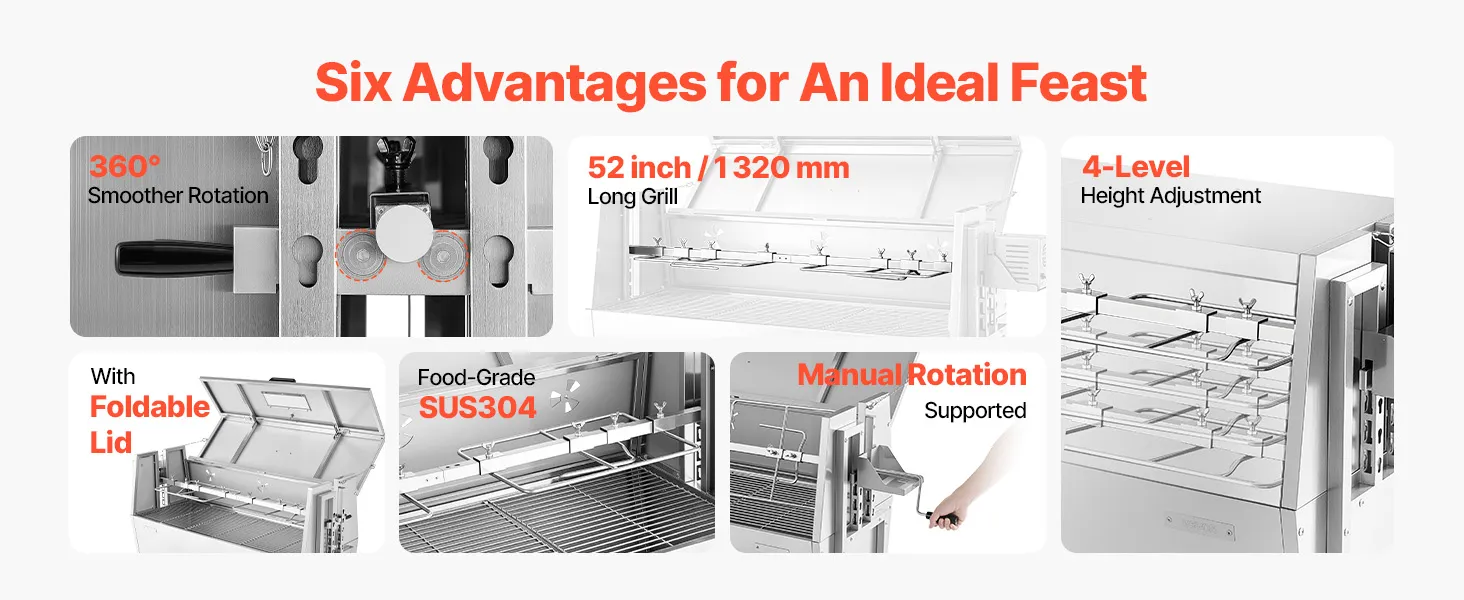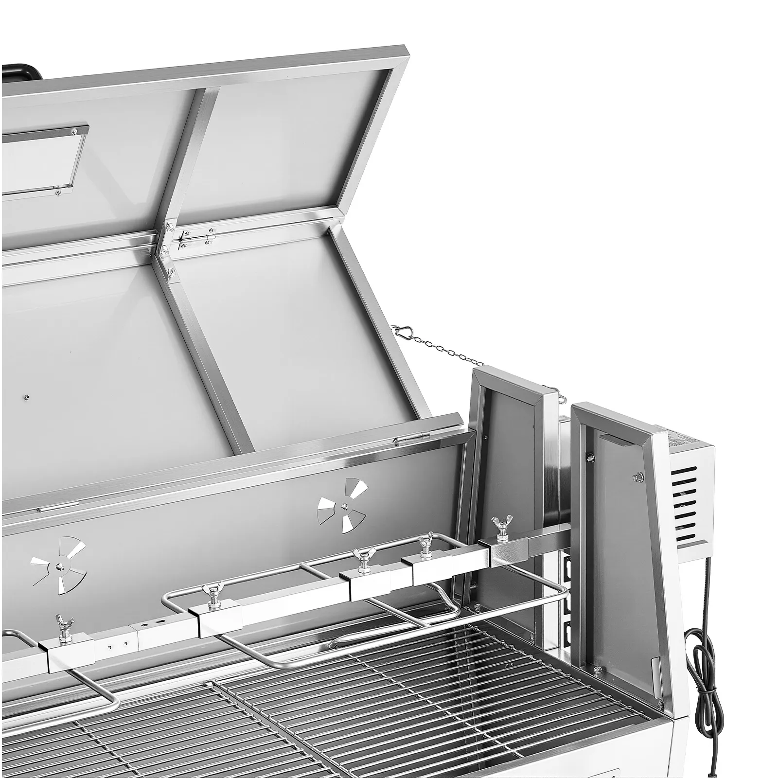 Deze 1320 mm (52 inch) draaispitgrill met een 38-watt motor en koelventilator draait soepel 360° en kan tot 60 kg (132 lbs) varkens- of lamsvlees bereiden. Vier instelbare hoogtes zorgen voor nauwkeurige warmteregeling, terwijl de vorken van SUS304 roestvrij staal en de roestvrijstalen constructie duurzaamheid en eenvoudige reiniging garanderen.