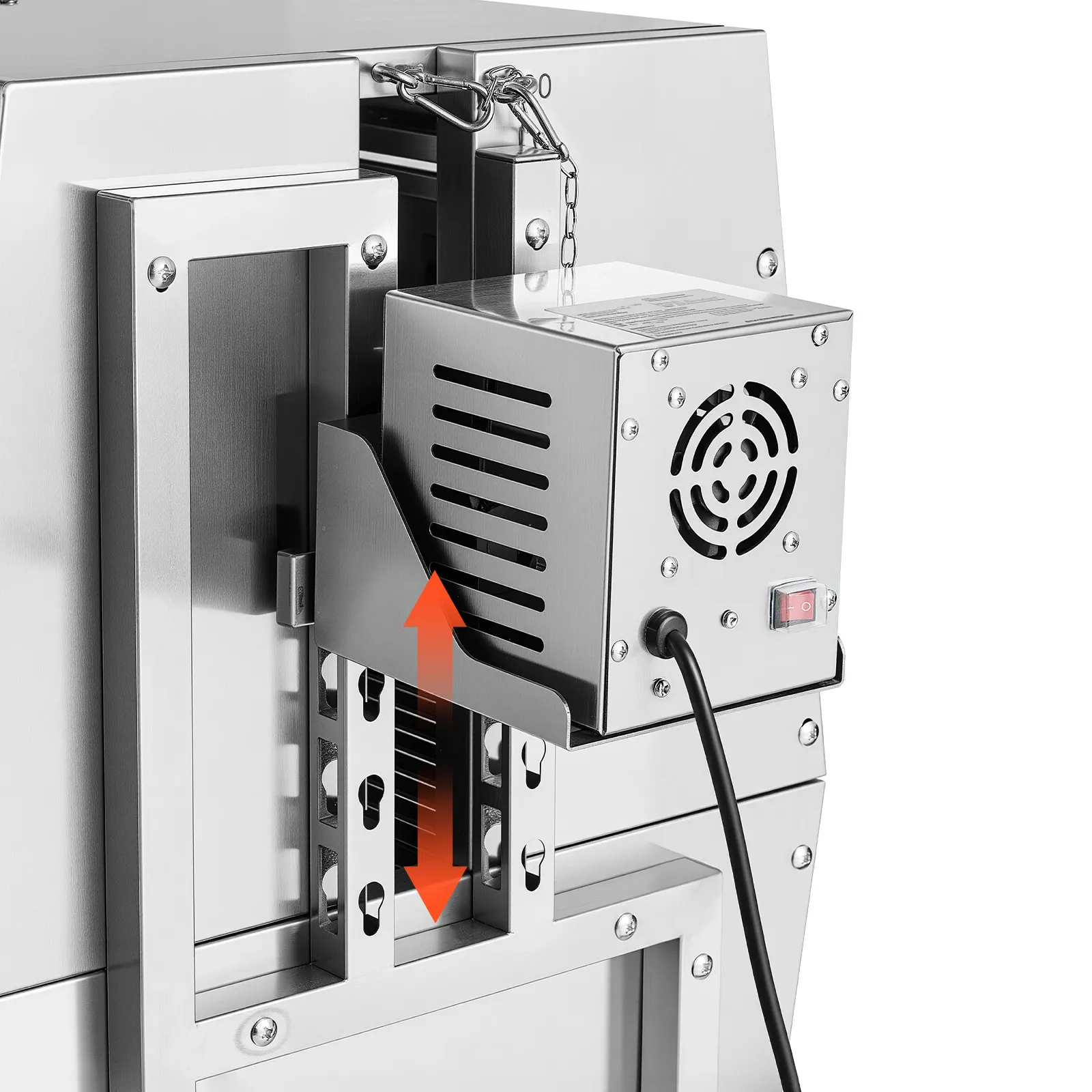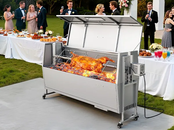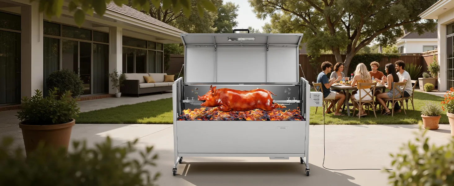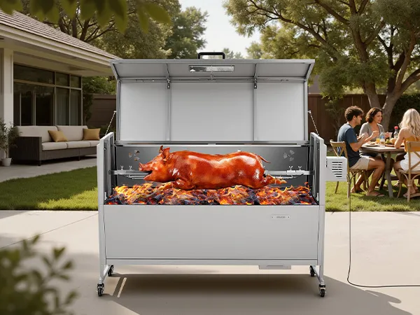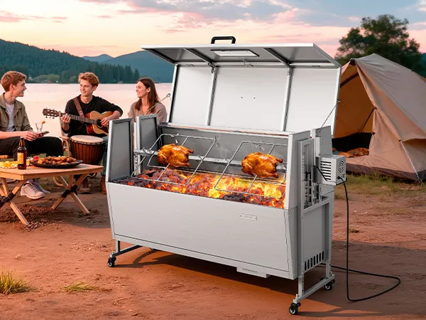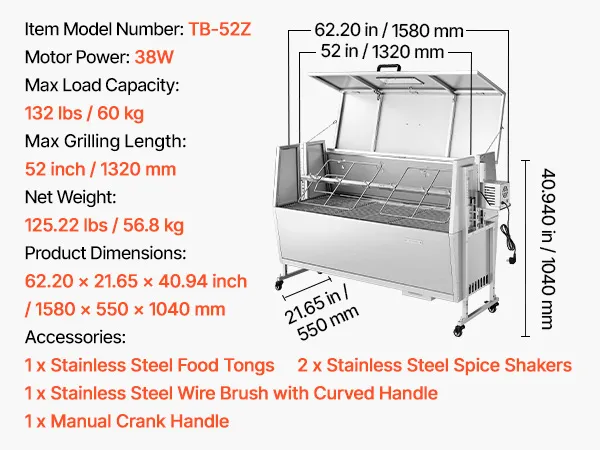 Deze 1320 mm (52 inch) draaispitgrill met een 38-watt motor en koelventilator draait soepel 360° en kan tot 60 kg (132 lbs) varkens- of lamsvlees bereiden. Vier instelbare hoogtes zorgen voor nauwkeurige warmteregeling, terwijl de vorken van SUS304 roestvrij staal en de roestvrijstalen constructie duurzaamheid en eenvoudige reiniging garanderen.