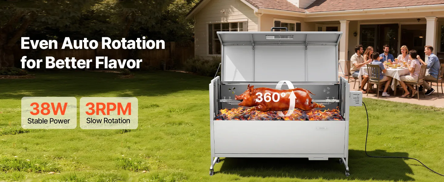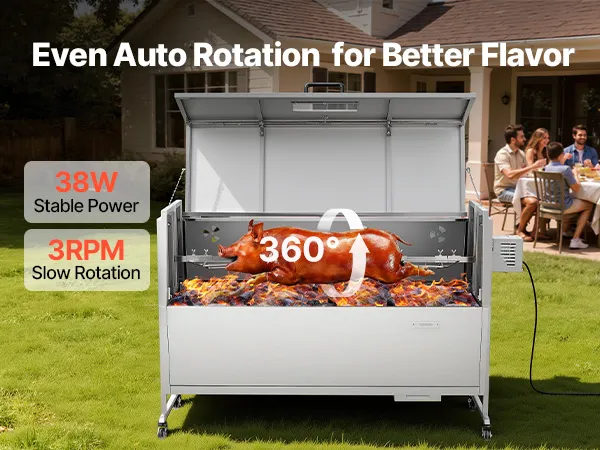 Moeiteloze rotatie: Met een 38W motor en 3 omwentelingen per minuut zorgt deze speenvarkensbraadoven voor een soepele en stille werking met minimale motorbelasting dankzij de dubbele lagers. De verbeterde ventilator garandeert constante prestaties zonder oververhitting.