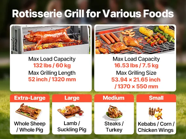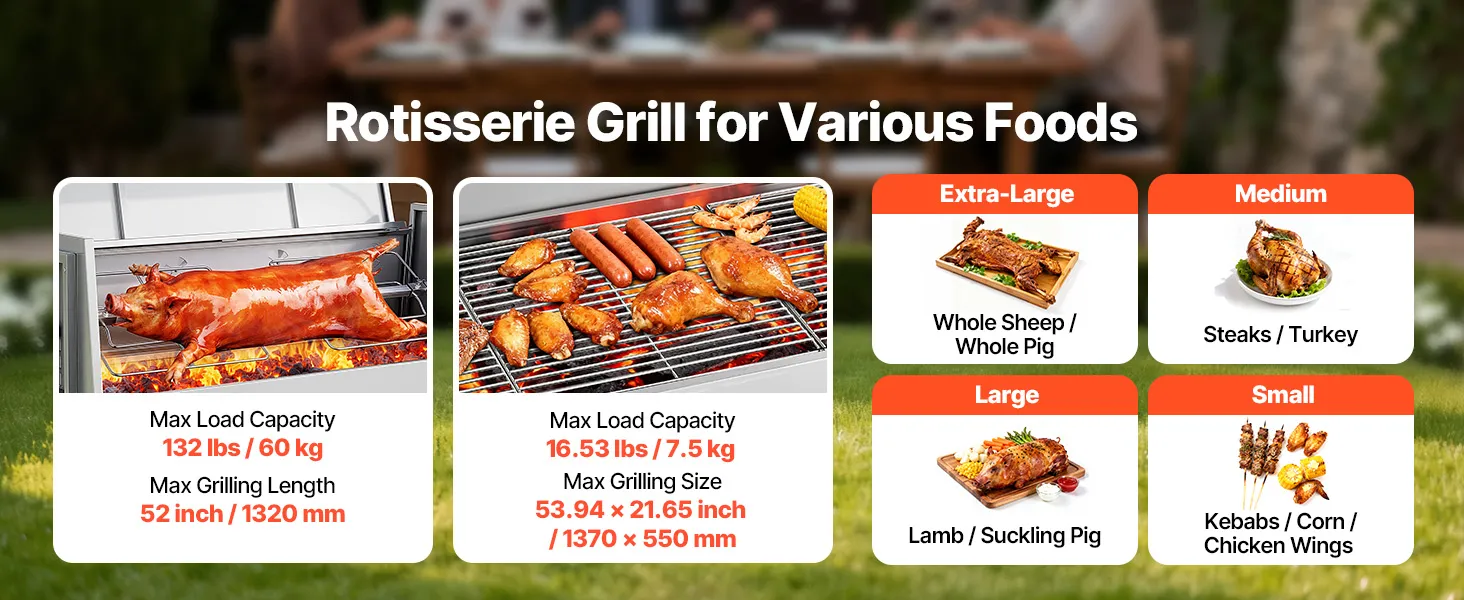 Maximale draagcapaciteit: De 132 cm (52 inch) grote speenvarkenbraadspit met een grilloppervlak van 1370 x 550 mm (53,94 x 21,65 inch) kan tot 60 kg (132 lbs) dragen en is ideaal voor varkensvlees, lamsvlees, kalkoen of een mix van vlees met groenten – voor een indrukwekkende en ongecompliceerde barbecue in de buitenlucht.