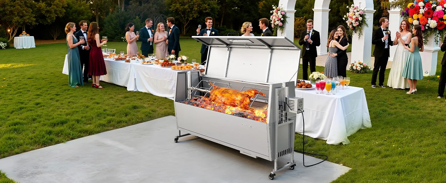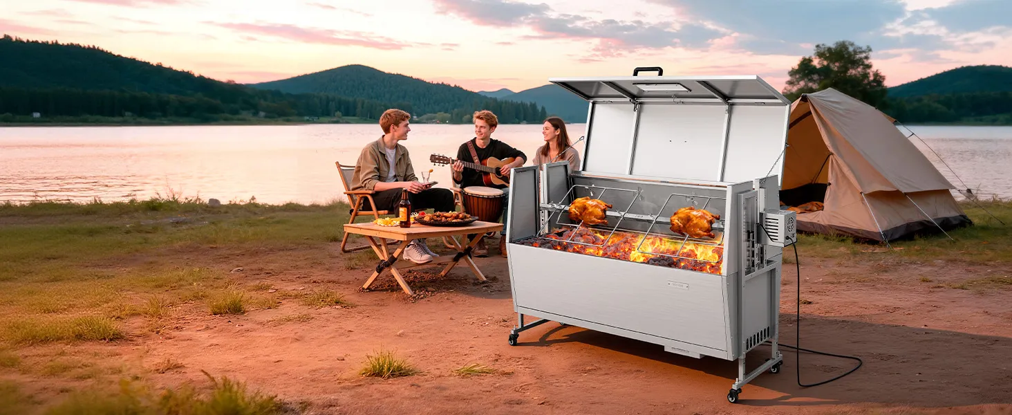 Draagbare elektrische rotisseriegrill voor buiten: Deze draagbare elektrische rotisseriegrill is ideaal voor alle buitenactiviteiten en is snel op te zetten voor het bereiden van hele varkens, lammeren, kalkoenen en runderen. De handmatige slinger zorgt voor een gelijkmatige garing en een heerlijke maaltijd, elke keer weer.