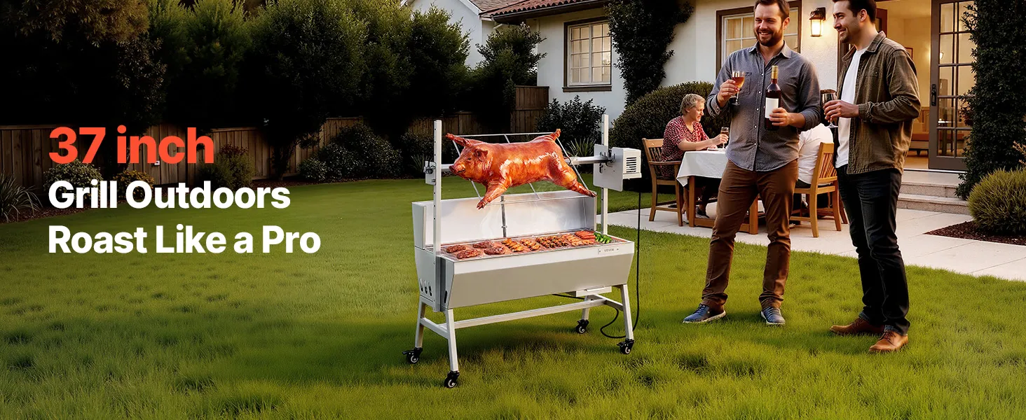 Stable Grill Capacity: With a 132 lbs/60 kg capacity, this rotisserie grill easily handles whole pigs (grate 16.53lb/7.5kg). Its 37-inch//940 mm rotisserie and spacious 37.01 x 16.34 inch/940 x 415 mm cooking area allow grilling meats and vegetables for a memorable outdoor feast