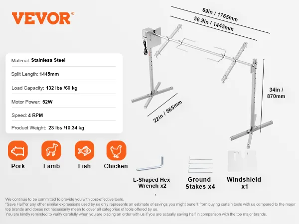 This rotisserie grill kit can rotate loads up to 132 lbs, making it ideal for roasting whole animals. Choose the appropriate grill net for various meats, offering plenty of space for all your needs.
