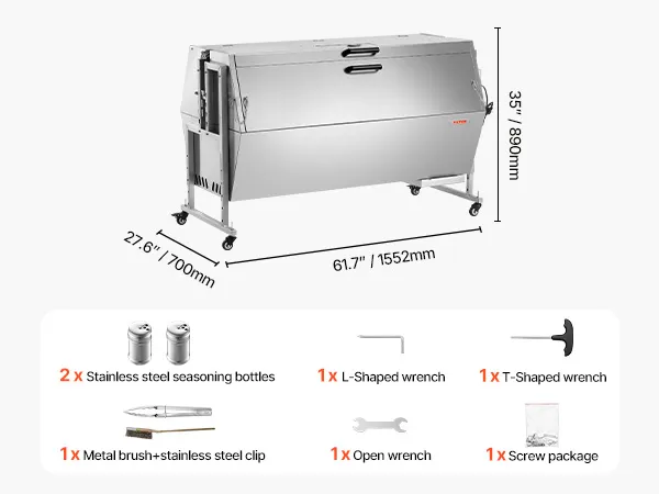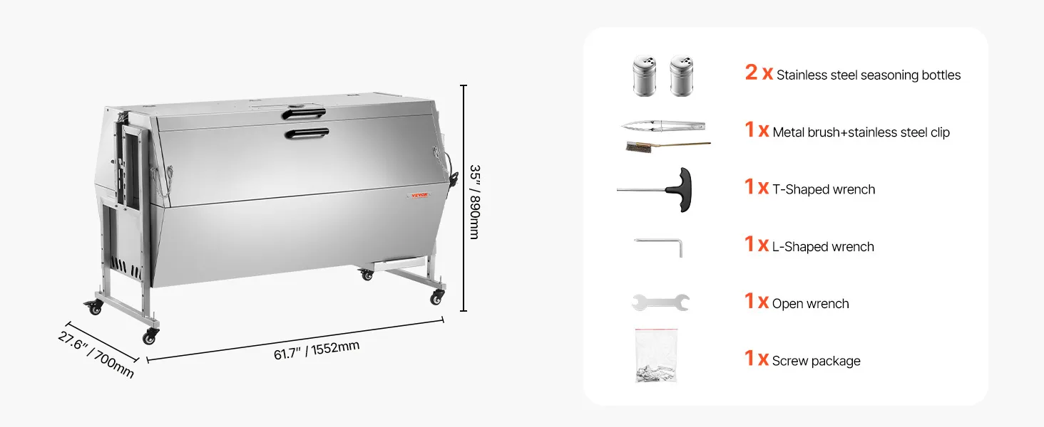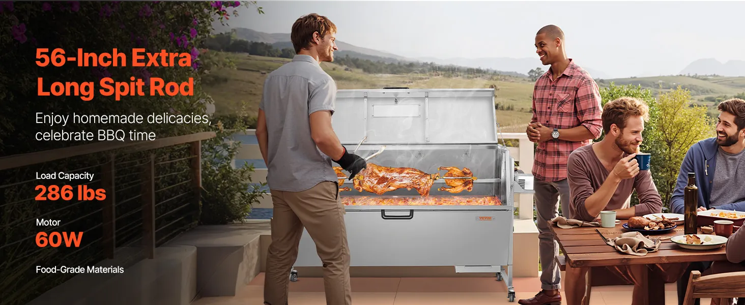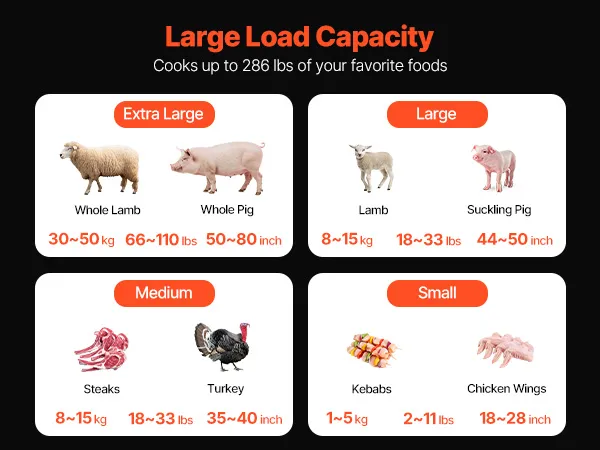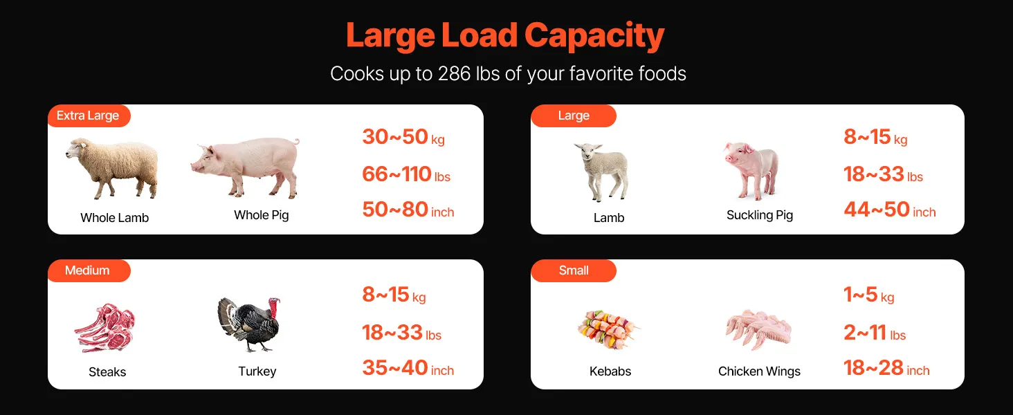 Grote laadcapaciteit: deze varkensgrillset heeft een totaal draagvermogen van 130 kg (286 lbs), beschikt over een grillnet dat 90 kg (198 lbs) kan dragen en wordt geleverd met een automatische grillvork. Houd er rekening mee dat het werkelijke maximale laadvermogen na voedselverwerking 40 kg (88 lbs) nettogewicht is