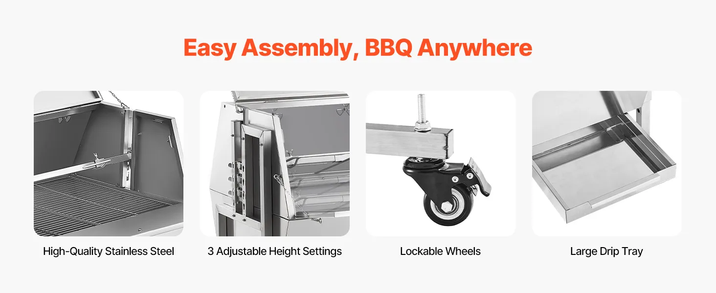 Gebruiksvriendelijk ontwerp: de roestvrijstalen braadpan is uitgerust met 4 afneembare en vergrendelbare wielen die het verplaatsen vergemakkelijken en meer stabiliteit bieden tijdens het koken. Het beschikt over een grote olielekbak van 142,24 x 33,02 cm (56 x 13 inch) om te voorkomen dat voedselvet ongecontroleerde interne temperaturen veroorzaakt, waardoor de smaak van de jongen behouden blijft.