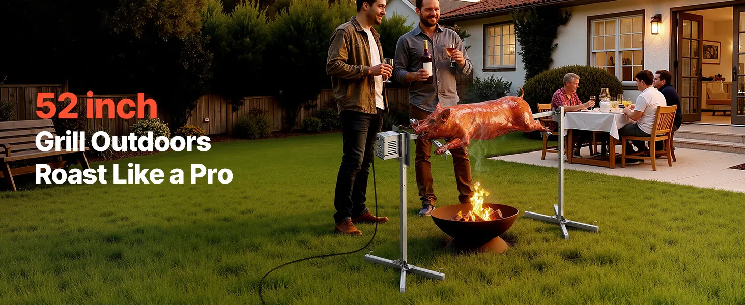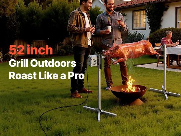 • Heavy-Duty Capacity: Designed to handle up to 132 lbs/60 kg, this rotisserie grill's 52-inch/1321 mm frame accommodates pigs, lambs, turkeys, and more. Ideal for creating large, evenly cooked meals that impress family and friends at any gathering