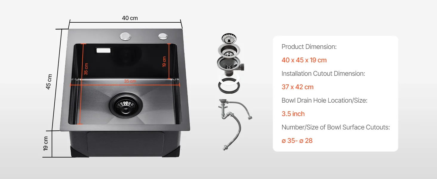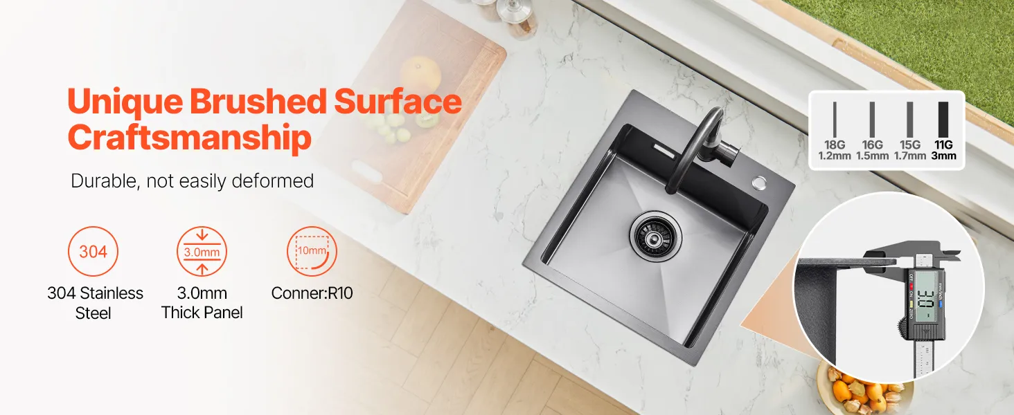 Premium Nano Black Finish: Met een innovatieve geborstelde nano PVD-afwerking is deze gootsteen corrosiebestendig, schokbestendig en gemakkelijk schoon te maken. Nogmaals, vermijd scherpe voorwerpen om krassen op het oppervlak te voorkomen. De verbeterde plaatdikte is 3 mm, 50% dikker dan de meeste standaard keukenspoelbakken. Het beschikt over afgeronde hoeken van R10° voor eenvoudige reiniging en een moderne esthetiek.