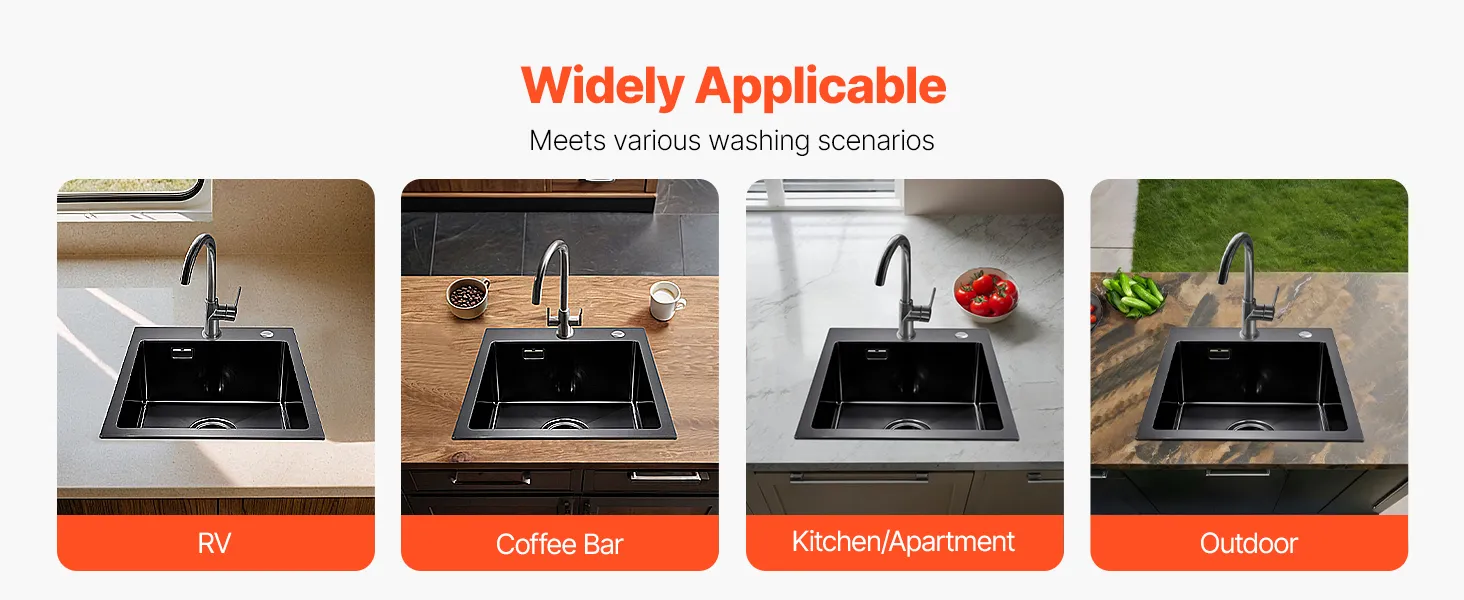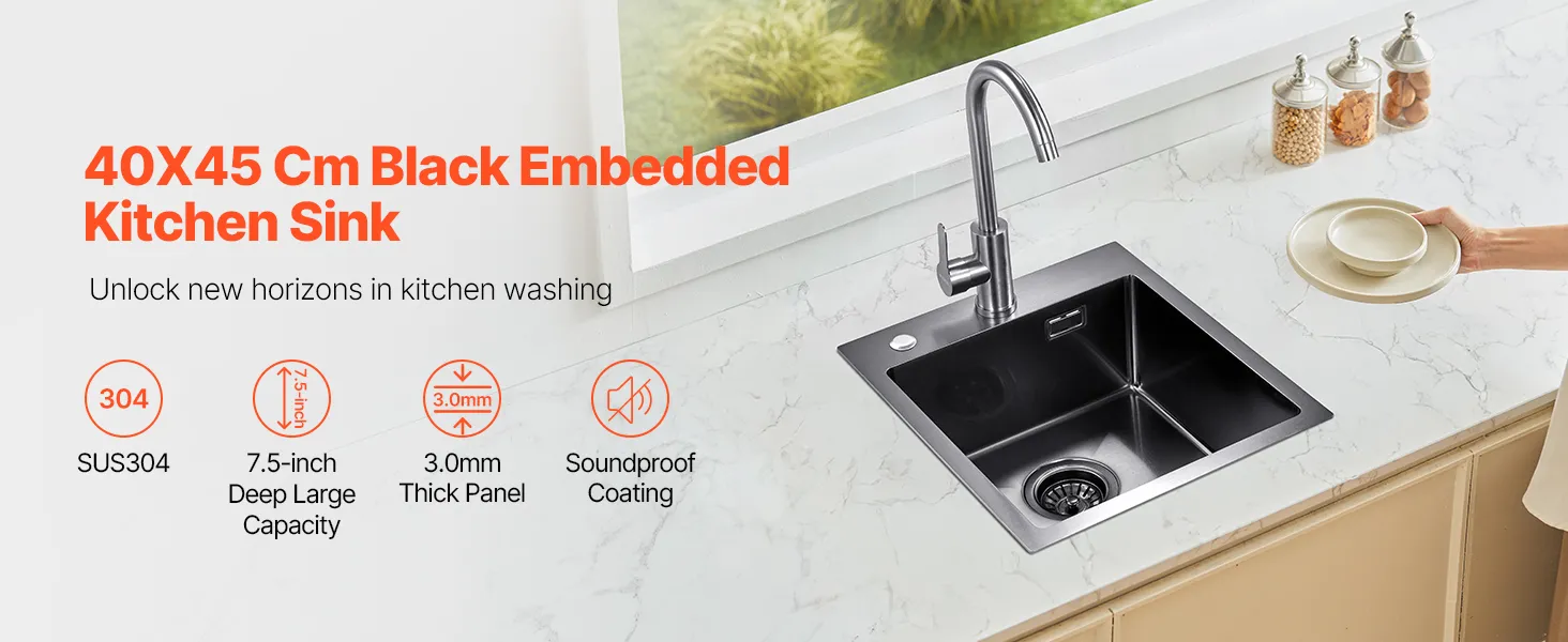 VEVOR Keukenspoelbak Inbouwspoelbak 40 cm Gemaakt van roestvrij staal Opzetspoelbakken, Enkele kom met accessoires, Huishoudelijke spoelbak voor RV Prep Keukenbar (Zwart)