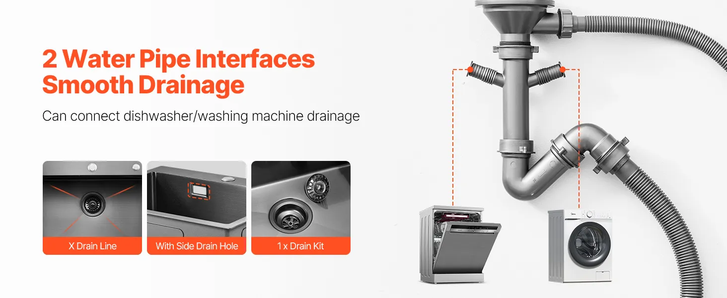 Snel drainagesysteem: deze bargootsteen heeft een X-vormig afvoerontwerp aan de onderkant, uitgerust met een afvoerkit om een snelle afvoer te garanderen en waterophoping te voorkomen. Het beschikt ook over een afvoeropening aan de zijkant en twee waterleidinginterfaces voor het aansluiten van vaatwassers, waardoor het legen soepel verloopt zonder de ophoping van voedselresten.