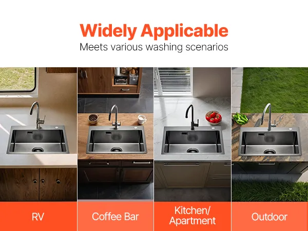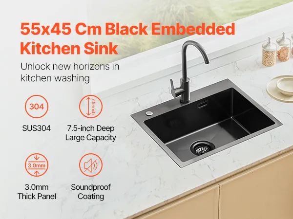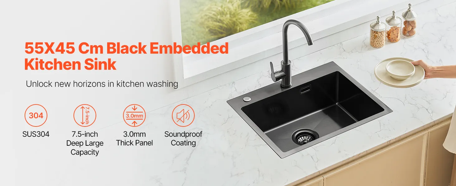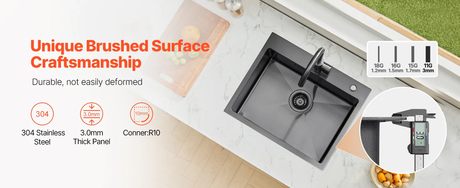 Premium Nano Black Finish: Met een innovatieve geborstelde nano PVD-afwerking is deze gootsteen corrosiebestendig, schokbestendig en gemakkelijk schoon te maken. Nogmaals, vermijd scherpe voorwerpen om krassen op het oppervlak te voorkomen. De verbeterde plaatdikte is 3 mm, 50% dikker dan de meeste standaard keukenspoelbakken. Het beschikt over afgeronde hoeken van R10° voor eenvoudige reiniging en een moderne esthetiek.