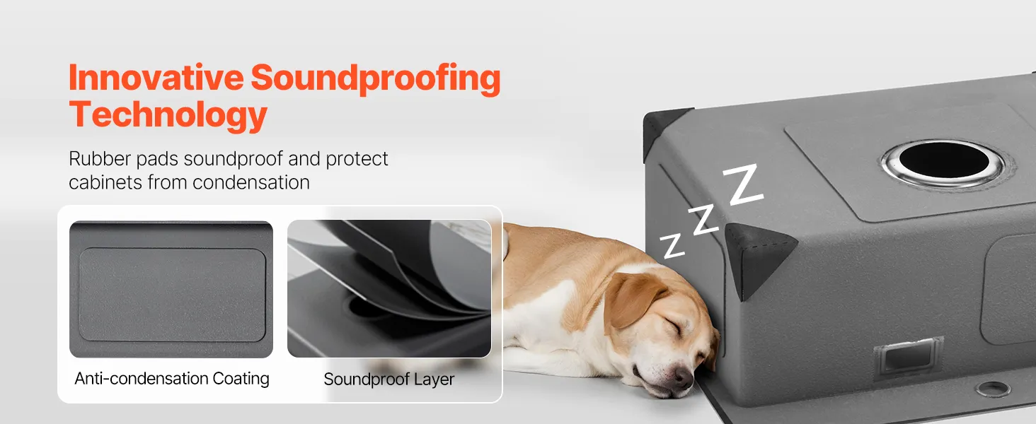Geluidsisolatie en anticondenslaag: Deze huishoudelijke vaatwasser is ultrastil en voorzien van dikkere, zachtere geluidsdempende rubberen pads. De geluiddichte pads en isolatiematerialen van de basislaag verminderen het geluid en zorgen voor een uitstekende geluidsisolatie en stilte, terwijl de dikke basislaag condensatie voorkomt.