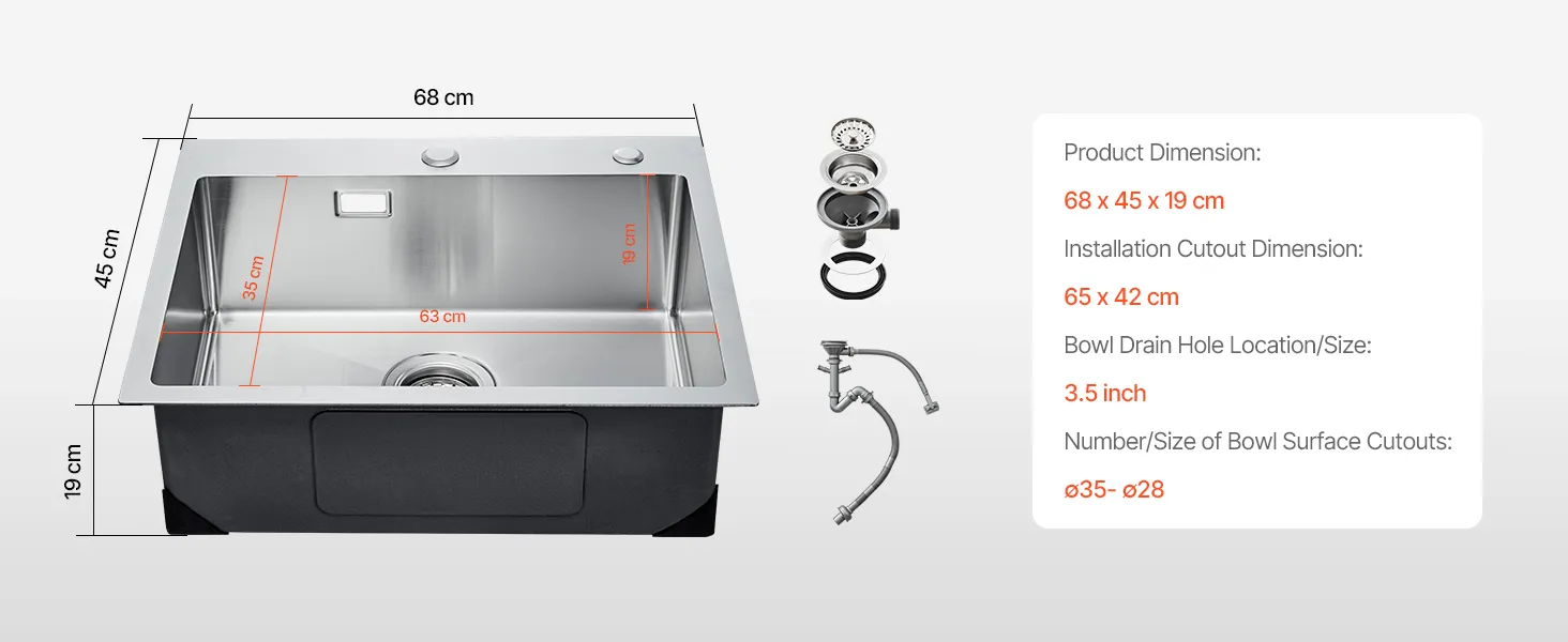 Grote capaciteit: buitenafmetingen van de spoelbak: 68 x 45 cm. Interne afmetingen: 65 x 42 cm. Diepte wastafel: 19 cm. Deze inbouwkeukenspoelbak is diep genoeg voor kopjes, pannen en bakplaten en voldoet aan diverse afwasbehoeften.