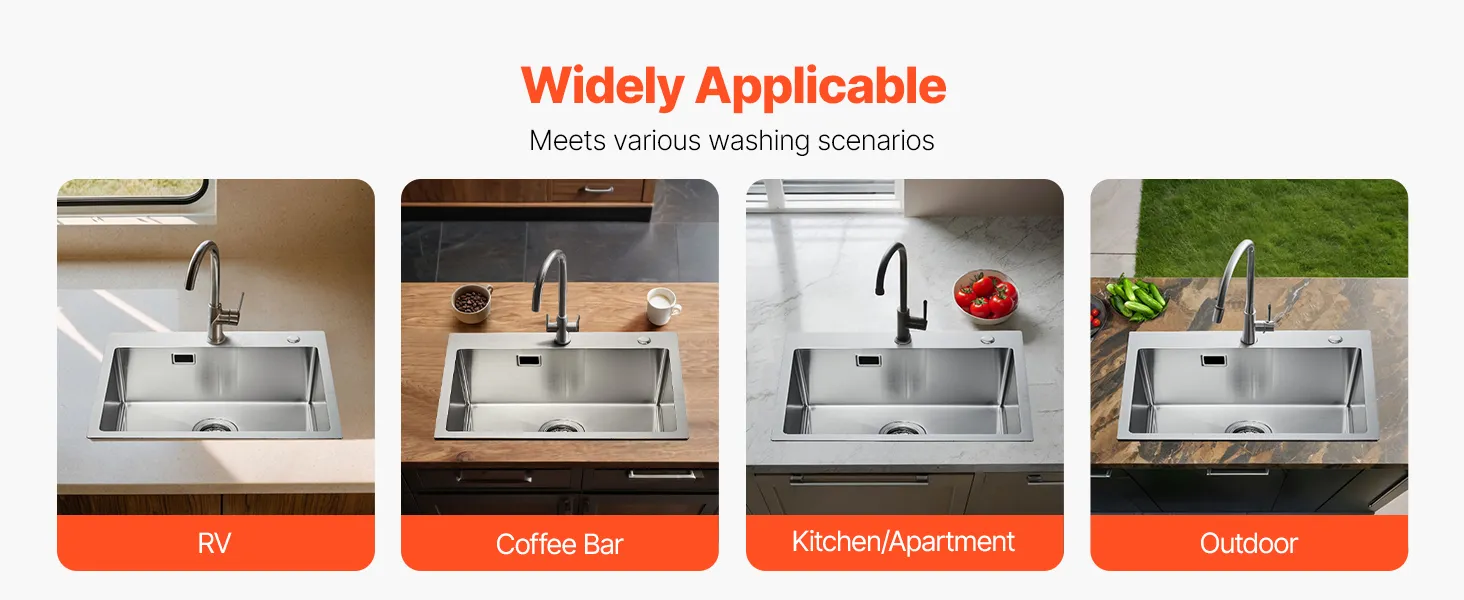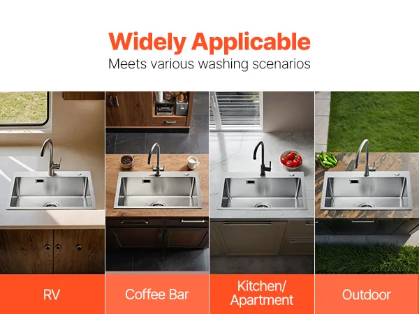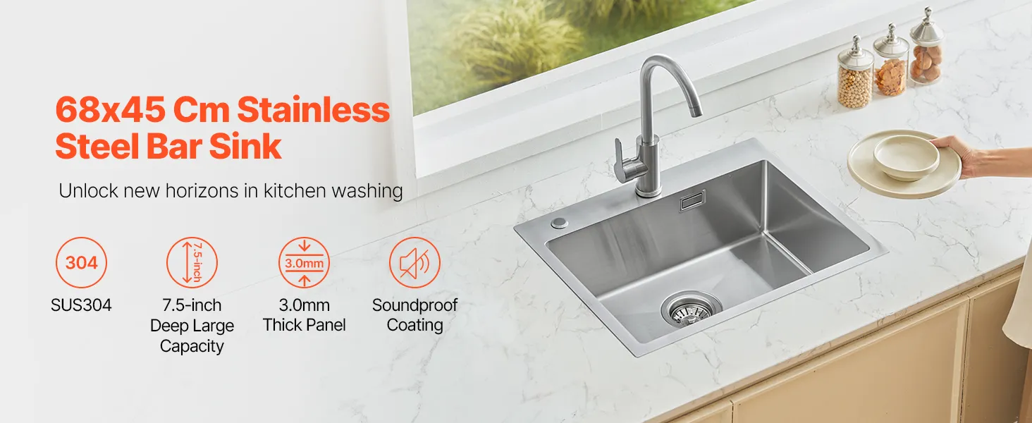 Aan de bovenkant gemonteerde roestvrijstalen keukengootsteen: onze roestvrijstalen bargootsteen vereist geen grote veranderingen aan uw keukenkasten of aanrecht. De ultradikke 3 mm 304 roestvrijstalen rand zorgt voor een veilige installatie op de bovenzijde en het dikke spoelbaklichaam zorgt voor duurzaamheid.