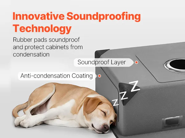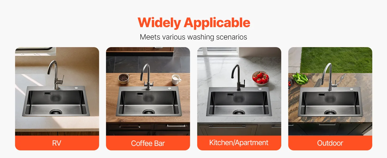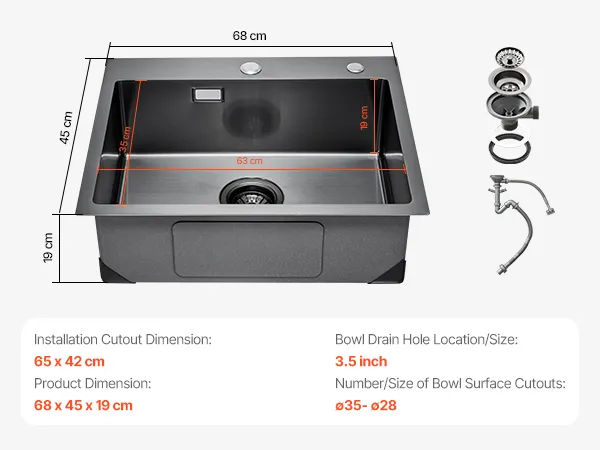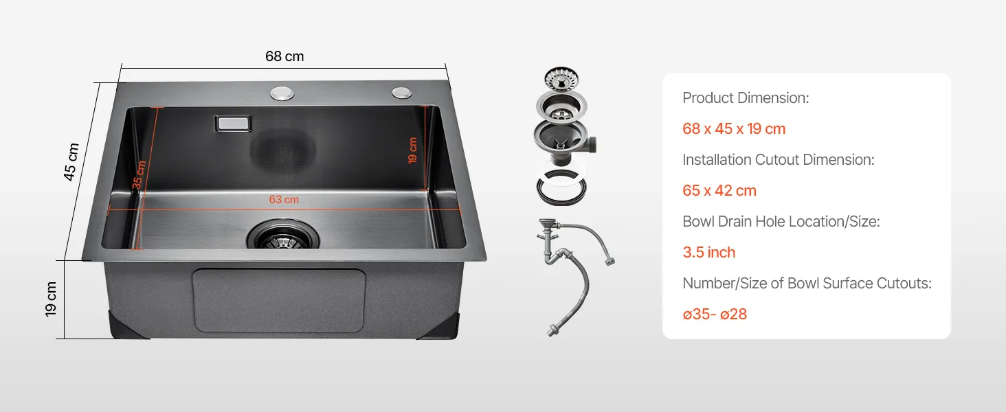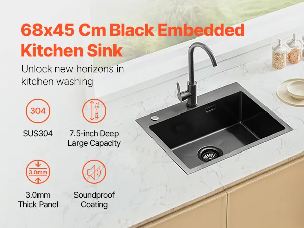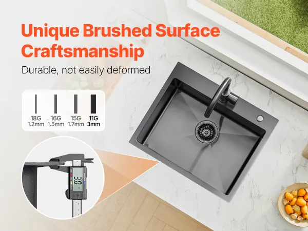 Premium Nano Black Finish: Met een innovatieve geborstelde nano PVD-afwerking is deze gootsteen corrosiebestendig, schokbestendig en gemakkelijk schoon te maken. Nogmaals, vermijd scherpe voorwerpen om krassen op het oppervlak te voorkomen. De verbeterde plaatdikte is 3 mm, 50% dikker dan de meeste standaard keukenspoelbakken. Het beschikt over afgeronde hoeken van R10° voor eenvoudige reiniging en een moderne esthetiek.