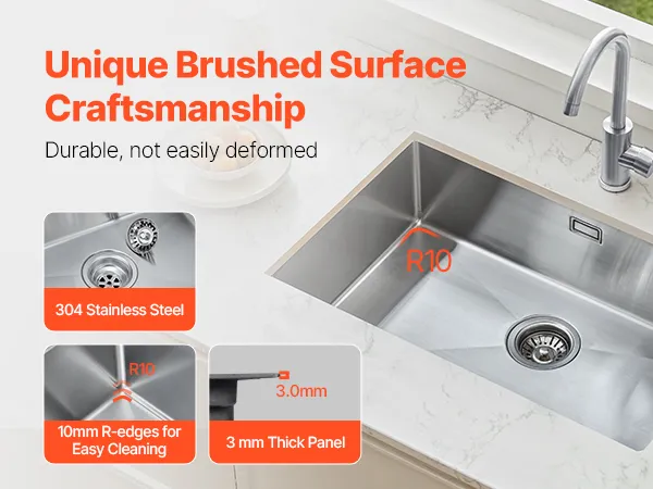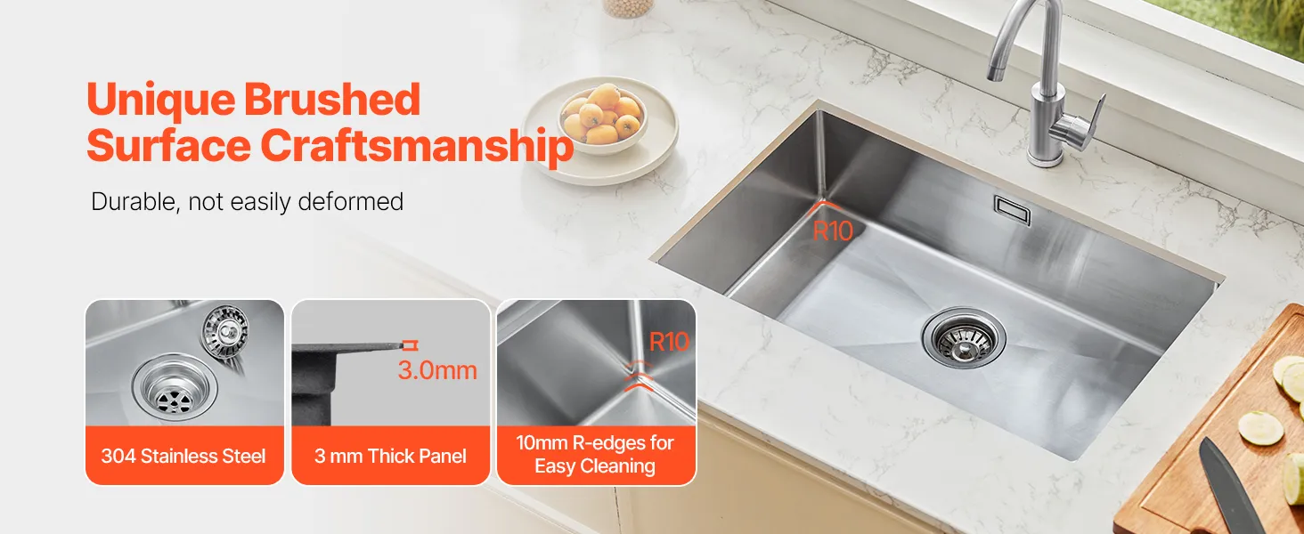 Robuust roestvrij staal: deze keukenspoelbak is gemaakt van hoogwaardig 304 roestvrij staal, wat duurzaamheid, roestbestendigheid en eenvoudige reiniging garandeert. Vermijd echter scherpe voorwerpen om krassen op het oppervlak te voorkomen. De verbeterde plaatdikte is 3 mm, 50% dikker dan de meeste standaard keukenspoelbakken. Het beschikt over afgeronde R10°-hoeken voor eenvoudige reiniging en een moderne esthetiek.