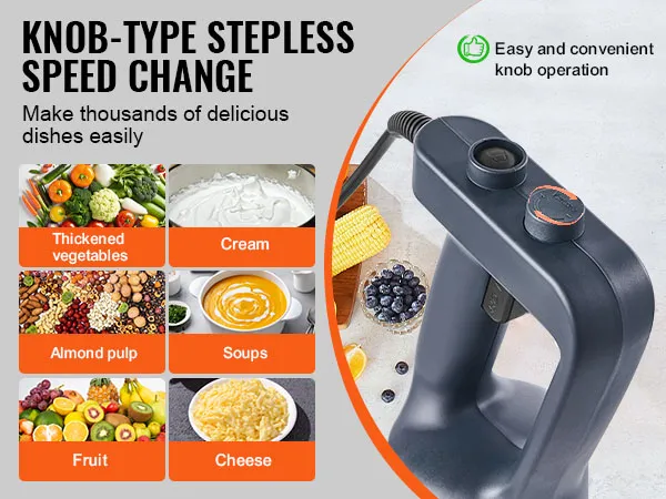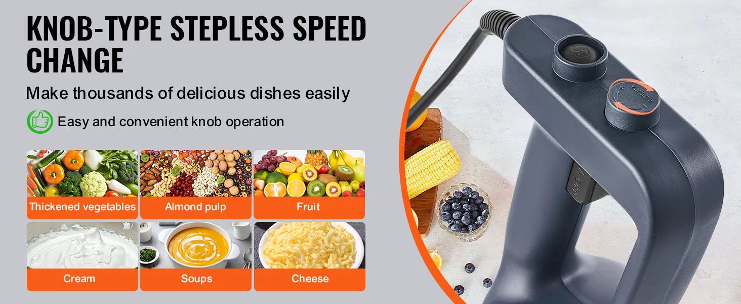 Stepless Variable Speed: Adjustable speed ranging from 4000 to 16000rpm allows for precise control with knob-operated infinite variable speed. Low speeds ensure stable foam reduction, while high speeds facilitate fast emulsification, giving you full control over the texture of your dishes.