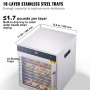 10-Layer Stainless Steel Trays: This food dehydrator has ten stainless steel trays that are food-grade 304 and measure 11.8 x 11 inches / 300 x 280 mm each. Each layer can hold up to 1.7 pounds of food, so you can dry different types of fruits and vegetables all at once.