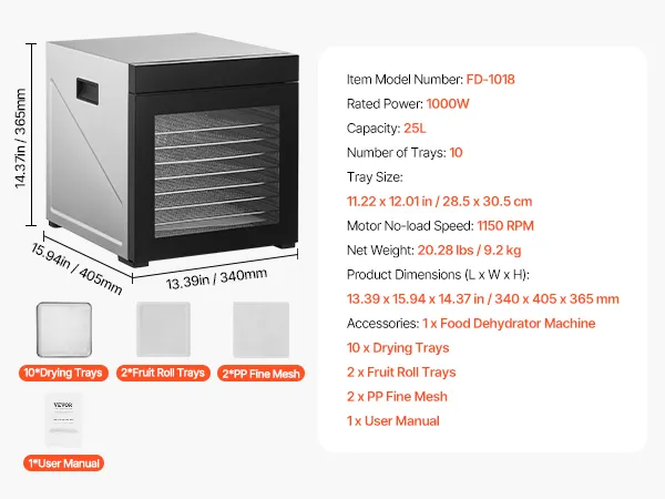 304 Stainless Steel Trays: The beef jerky dehydrator machine comes with ten 304 stainless steel trays (11.22 x 12.01 in / 28.5 x 30.5 cm) for direct contact with food with peace of mind. These durable trays offer excellent weight support, with a design that prevents them from falling. Comes with two food-grade silicone fruit rolls that can be used to make fruit roll slices
