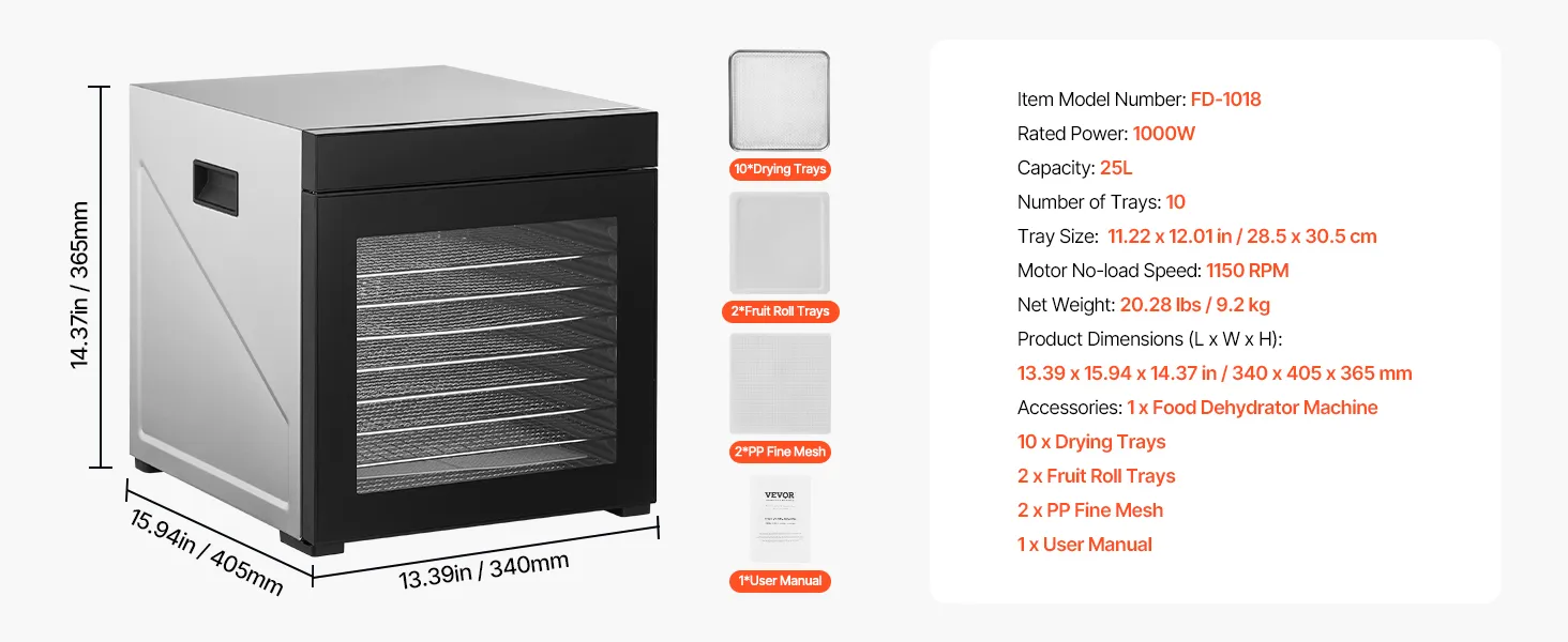 Efficient & Even Drying: With an upgraded thickened heating tube and large fan, the heating tube generates heat while the fan circulates the warm air inside, evenly penetrating the food. The food dehydrator machine ensures even drying while preserving nutrients without loss