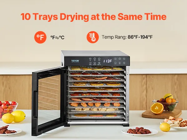 10-Layer Large Capacity: This large dehydrator can hold up to ten layers of food at once, drying large amounts of ingredients in one go. Control with a smart digital display, adjustable from 99℉ to 170℉ / 37.4℃ to 77℃, and a 48-hour intelligent timer means no need for manual supervision. Perfect for dehydrating various fruits, vegetables, jerky, herbs, teas, and seafood