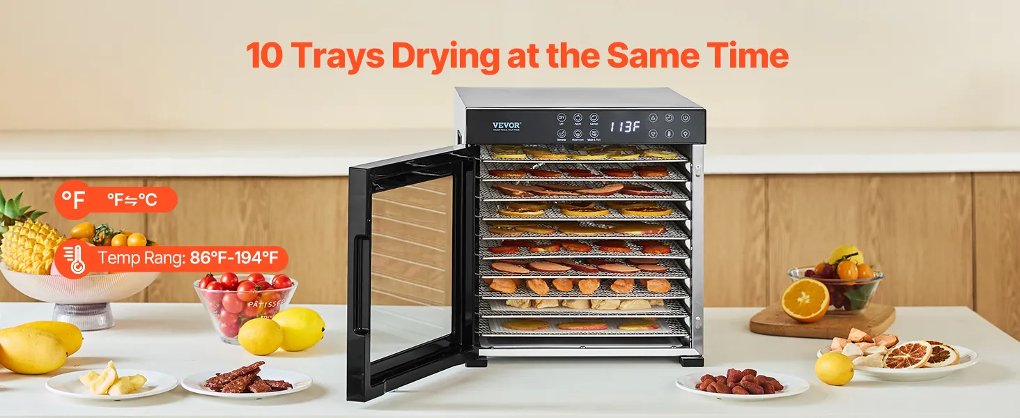 With a 10-layer capacity, the large dehydrator machine is perfect for dehydrating various ingredients, including fruits, vegetables, jerky, herbs, seafood, grains, and more. It also comes with a recipe, enabling you to make various healthy, homemade dried food easily.