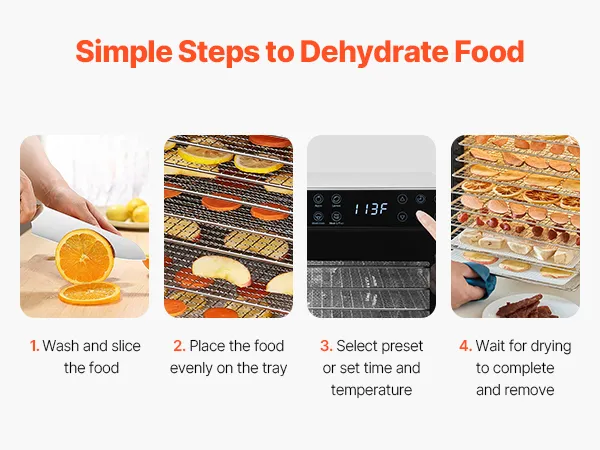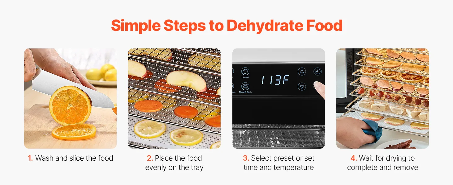 The food dehydration and drying process is very easy. It's recommended to choose fruits and vegetables with rich flesh, and carefully select the best ingredients before drying, removing any spoiled, overripe, or unripe ones.