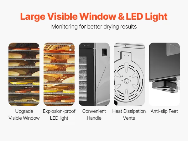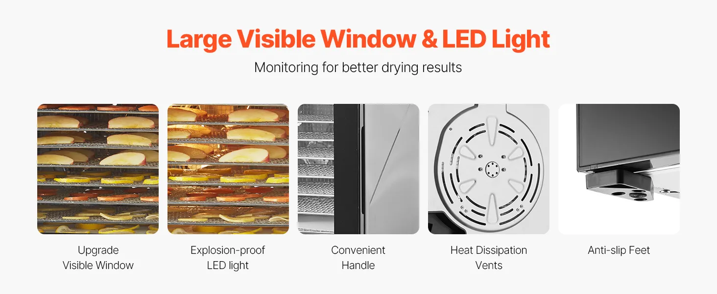 Visible Window: Equipped with a large visible window and built-in explosion-proof LED light, the drying progress of your food is clearly visible. The strong core bearing motor ensures the fan runs smoothly and quietly, operating without disturbing your family