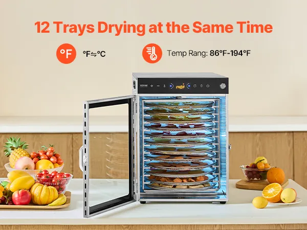 12-Layer Large Capacity: This large dehydrator can hold up to twelve layers of food at once, drying large amounts of ingredients in one go. Control with a smart digital display, adjustable from 86℉ to 194℉ / 30℃ to 90℃, and a 24-hour intelligent timer means no need for manual supervision. Perfect for dehydrating various fruits, vegetables, jerky, herbs, teas, and seafood