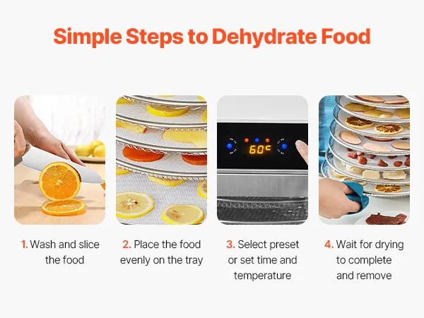 The food dehydration and drying process is very easy. It's recommended to choose fruits and vegetables with rich flesh, and carefully select the best ingredients before drying, removing any spoiled, overripe, or unripe ones.