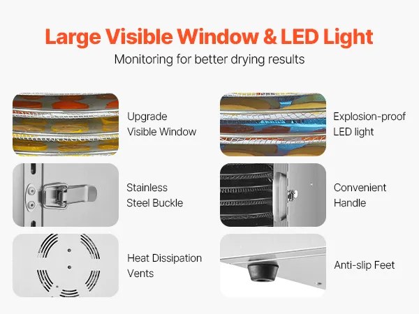 Visible Window: Equipped with a large visible window and built-in explosion-proof LED light, the drying progress of your food is clearly visible. The strong core bearing motor ensures the fan runs smoothly and quietly, operating without disturbing your family