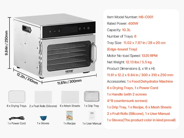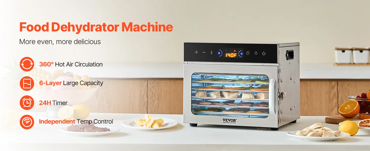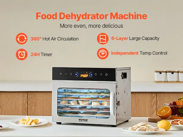 Efficient & Even Drying: With an upgraded thickened heating tube and large fan, the heating tube generates heat while the fan circulates the warm air inside, evenly penetrating the food. The food dehydrator machine ensures even drying while preserving nutrients without loss